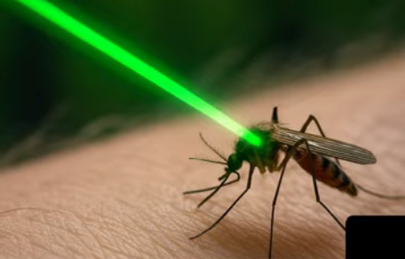 the audio frequency created by the beating of mosquito wings triggers the laser beam, the mosquito’s wings are burnt off and its smoking carcass falls to the ground