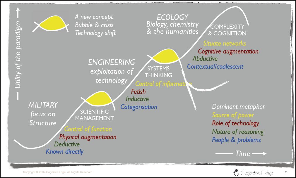Loving this update by Dave Snowden of the ‘three paradigms over time’ S Curves from his recent talk at the International Risk Assessment and Horizon Scanning Symposium 2010. The podcast and slides can be found embedded in his latest blogpost.