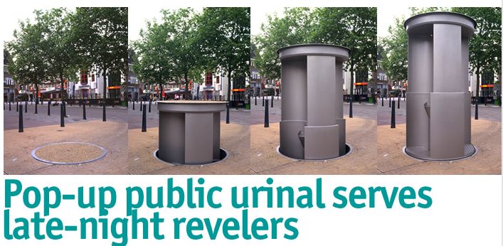 Not sure what lady late night revelers are expected to do and also notice that the text reveals there are three urinals per ‘pop-up’, without doors, so this is much more European, pissoir solution. And what do you do if, in full flow, it starts to descend?