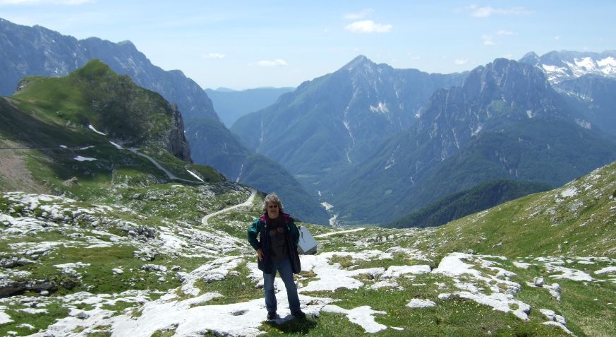 Yesterday morning David’s friends Milan and Andreja joined us for coffee. Milan was the Slovenian ambassador in Croatia. Milan then drove us west across the border into the Italian Alps then back round and up the most convoluted road I have ever experienced. Hairpin bends, sheer drops and cyclists and oncoming drivers to contend with we inched our way to the top.
