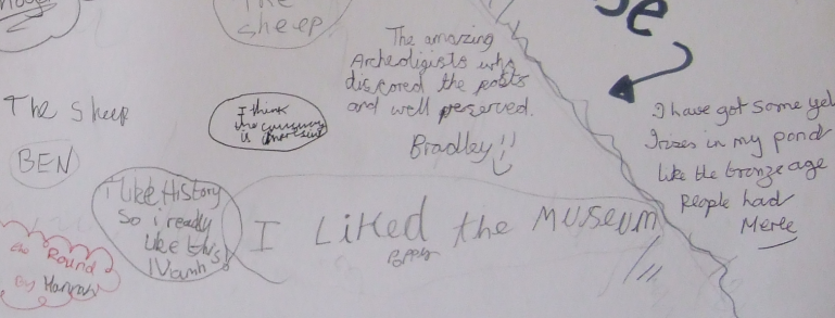 Evidence of the bronze age prototype of SenseMaker where visitors narrative fragments are captured on rice paper lining the walls of the houses.