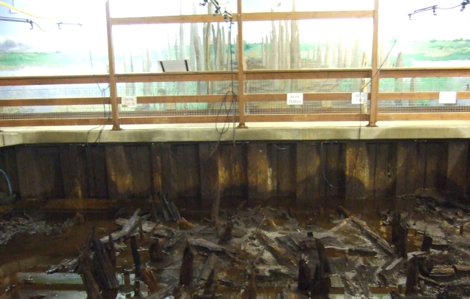 Here the ancient timbers (bottom of picture) still in-situ, are kept damp to preserve them. The painted landscape behind show the ancient walkway across the fen
