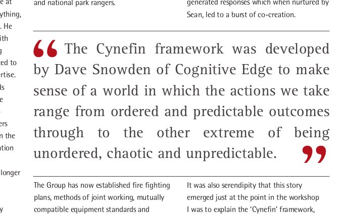 During the latter part of last year I facilitated three consultation workshops for the fire sector. At the one in a fire-station in Moss side, Manchester we were doing an anecdote circle to explore the narrative landscape and the subject of wildfires arose. Because fires figure regularly in my explanation of the chaotic domain of the cynefin framework I must have given a more impassioned set of examples that day, as I was asked soon after if I would write an article on cynefin for the Alert magazine (The Journal of the Institute of Civil Protection and Emergency Management). I am therefore honoured to be in the latest edition concerning itself with Resilience against the floods, the Glasgow Helicopter Crash, Crisis Management, DNA profiling and a whole lot more.