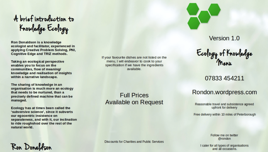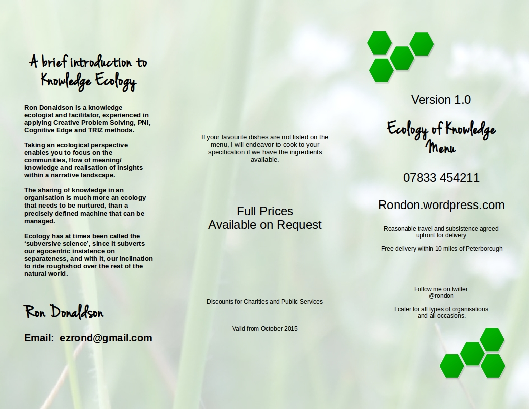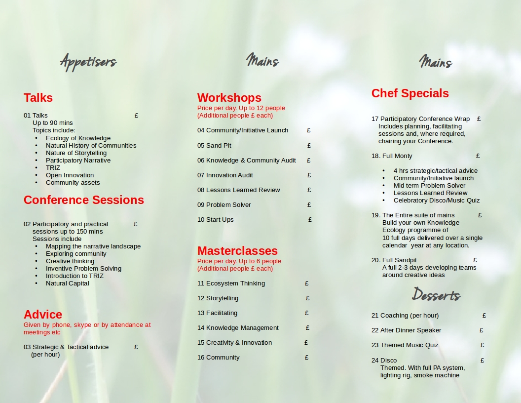 I have finally managed to create a menu of services that I am happy with. Click on either image to enlarge. The PDF version can be downloaded here, a version complete with prices is available on request..