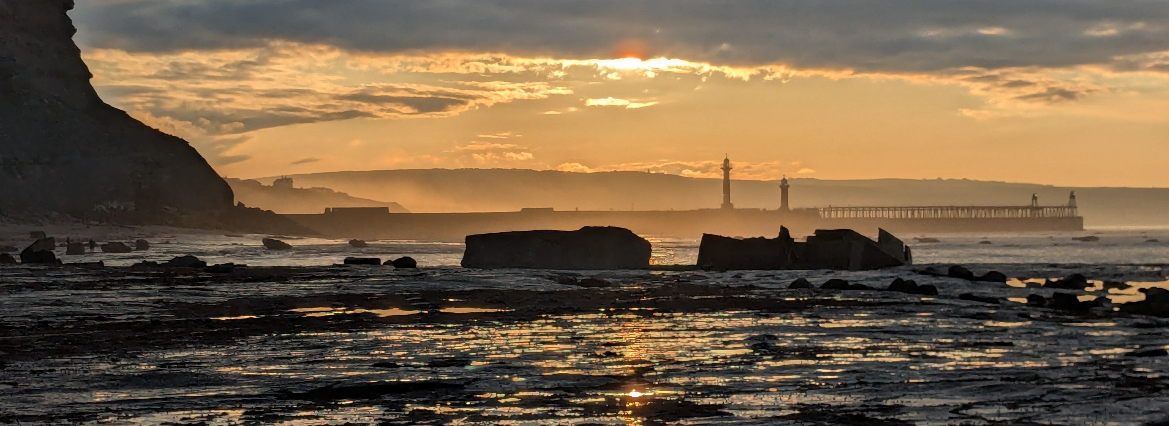 [Photo taken on Whitby East Shore in 2025. My favourite place to be. A truly liminal zone, at this moment being between low and high tide, between day and night as the sun sets and between land and sea]